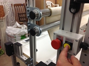 Before the motors will engage, you must press the yellow button in order to allow electricity to go to the servo motors. You must press this button before the computer can send signals to drive the machine. The big red button cuts the electricity off to the servo motors. In an emergency you can whap it or slap it to make the sew head stop moving. It’s specially designed so re-engage after pressing the red button you will have to pull out the red button and rotate it about a 1/4 turn. After that, you can then press the yellow button to allow the signals to flow to the servos again.