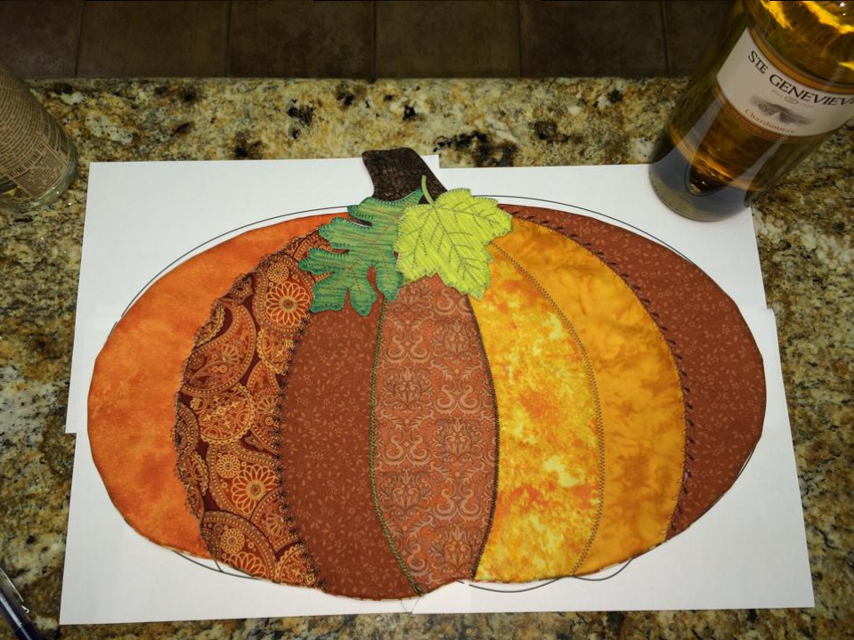 There is absolutely nothing on a pumpkin that is a straight line. So, I decided that instead of strips, we’d do curves instead, easy-peasy no-pin mild gentle curves that would suggest the 3D shape of the pumpkin. Great! I drew out a pattern and it is beautiful! Oh no! I realized we can’t do the stitch a strip and flip it over technique as easily now. We got those curves to deal with. This is intended to be a beginner level class… so what am I to do?